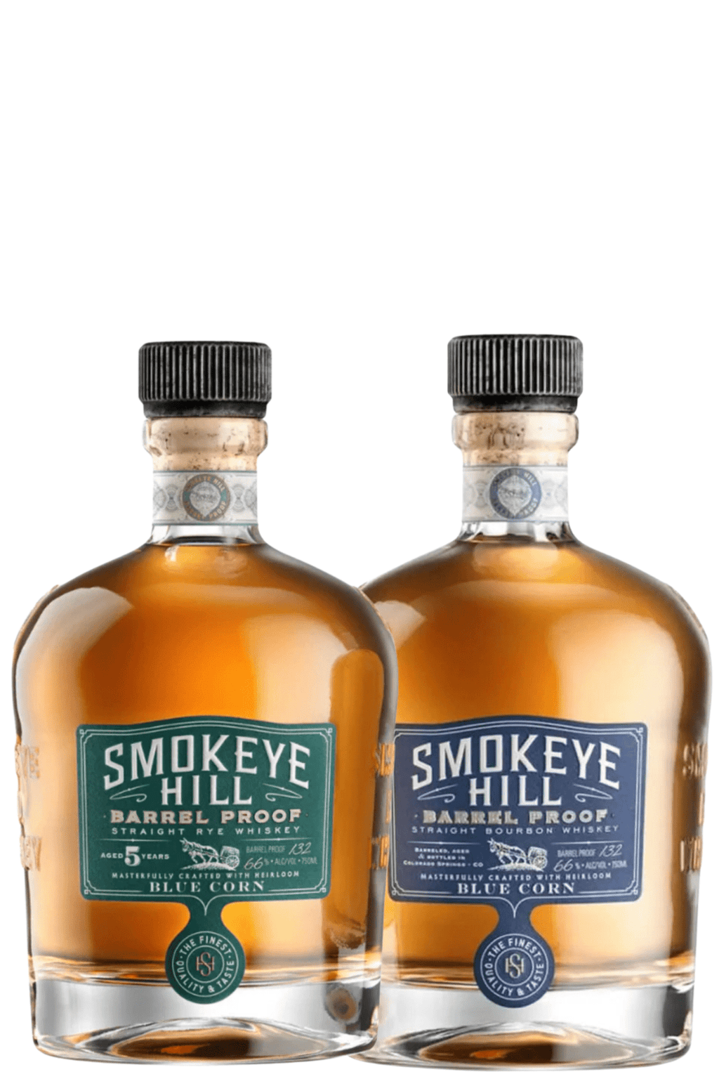 Discover the bold frontier of American whiskey with this Smokeye Hill Barrel Proof Bundle, featuring both Straight Rye and Straight Bourbon expressions—each crafted with heirloom blue corn and bottled at an intense 132 proof (66% ABV).