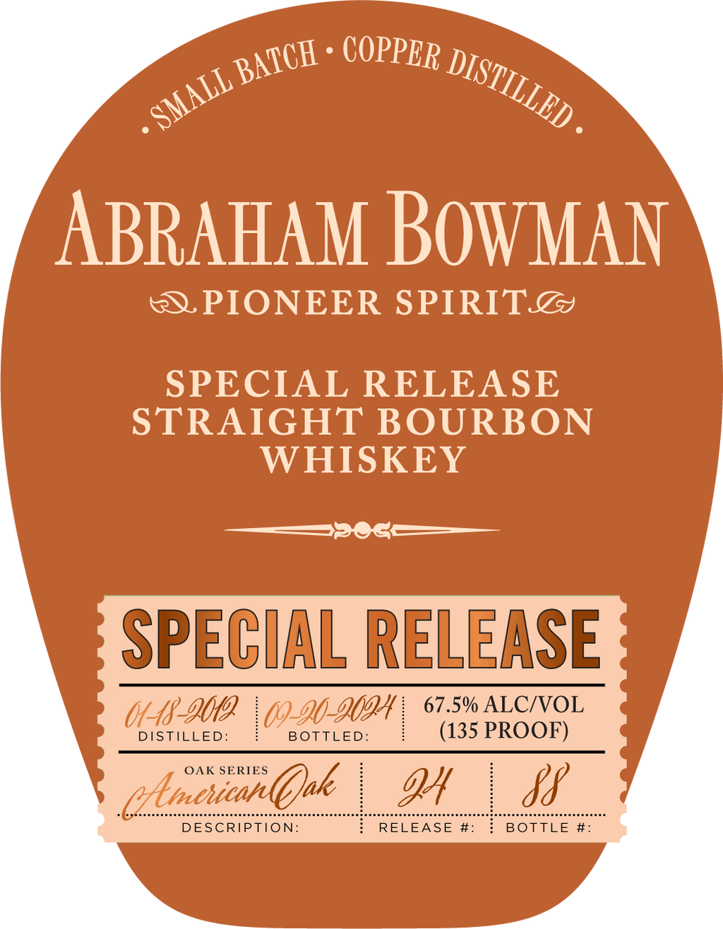 The Abraham Bowman Pioneer Spirit Special Release Straight Bourbon Whiskey - American Oak Series is a premium, small-batch bourbon that offers a bold and robust flavor. Bottled at an impressive 67.5% ABV (135 Proof), this bourbon is crafted to satisfy those who enjoy their whiskey with a powerful kick.