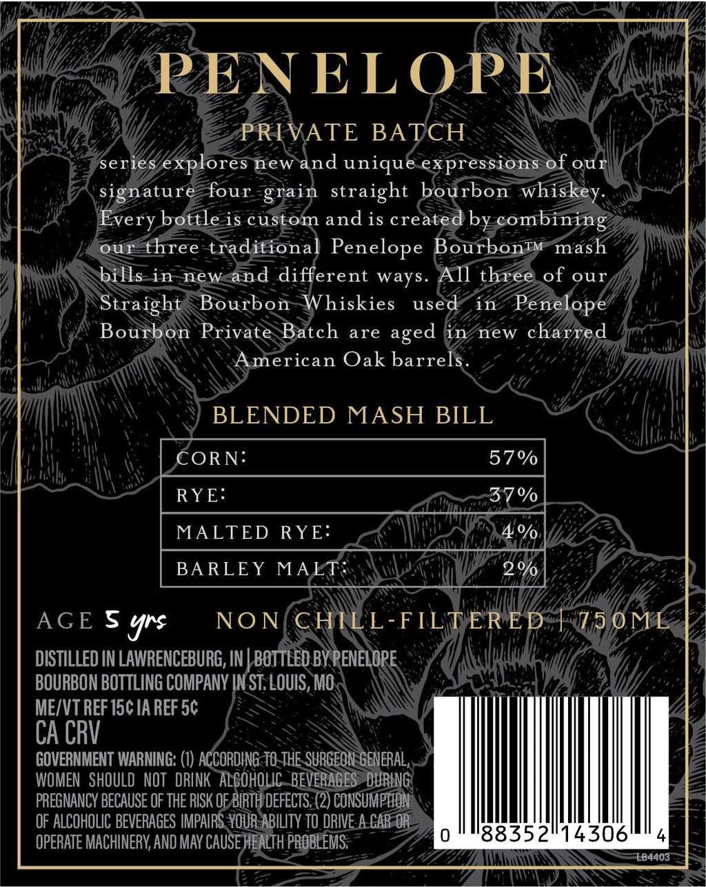 Penelope Bourbon Barrel Strength Private Batch is a bold and meticulously crafted straight bourbon whiskey. Aged for 5 years and bottled at a robust 117 proof (58.5% ABV), this non-chill filtered bourbon is a unique blend of Penelope's signature four grains: 57% corn, 37% rye, 4% malted rye, and 2% barley malt. Aged in new charred American oak barrels, it delivers a rich complexity, marrying sweet corn and spice-forward rye with subtle hints of malted grains, offering a beautifully balanced and full-flavored whiskey experience.