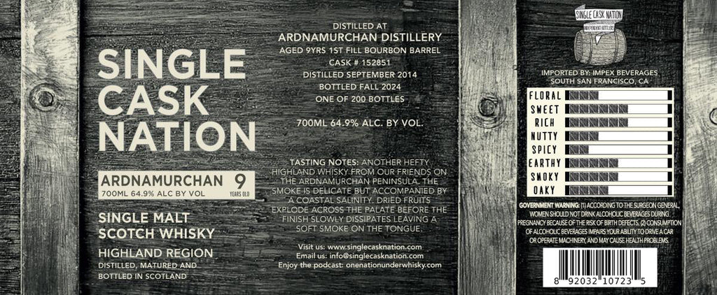 Single Cask Nation’s Ardnamurchan 9-Year Single Malt Scotch Whisky is a bold and nuanced Highland whisky from Scotland’s Ardnamurchan Distillery. Aged in a first-fill bourbon barrel, this single malt boasts a robust ABV of 64.9%, offering a powerful cask-strength experience. Limited to just 200 bottles, this whisky presents a delicate smoky profile with coastal salinity, balanced by bursts of dried fruit flavors and a soft, lingering smoke on the finish. Perfect for whisky enthusiasts looking for a complex and rare Highland expression.