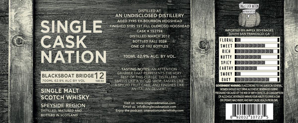 Uncover the distinct character of Single Cask Nation’s Blacksboat Bridge 12-Year Single Malt Scotch Whisky. This exceptional whisky, distilled at an undisclosed Speyside distillery, was aged for 7 years in an ex-bourbon hogshead before a 5-year finish in a first-fill Oloroso sherry hogshead, creating a complex profile brimming with rich flavors. Bottled at a robust cask strength of 62.9% ABV, this limited release offers just 192 bottles, perfect for the discerning collector. Expect enticing aromas of wood shavings and Italian desserts with a full-bodied palate of spiced fruit cake, oak, and a lingering sherried finish.