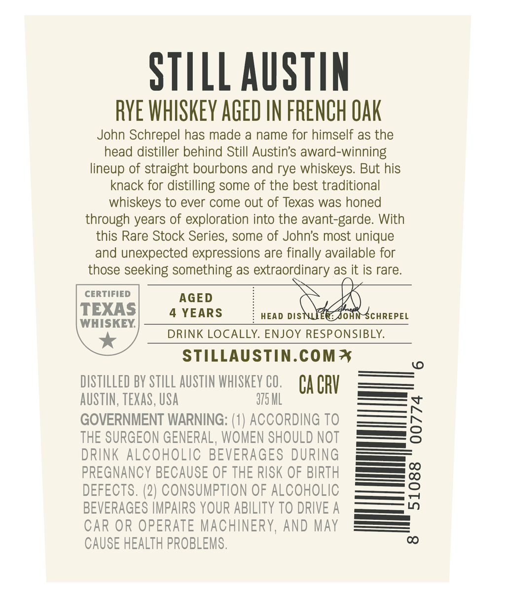 Still Austin Rare Stock Rye Whiskey is a unique and extraordinary expression, handcrafted by master distiller John Schrepel. Aged for 4 years in French oak barrels, this rye whiskey is part of the highly sought-after Rare Stock Series, showcasing some of the most distinct and avant-garde releases to come out of Texas. Made with 100% Brasetto rye, this whiskey offers a bold yet sophisticated flavor profile, bottled at 56.8% ABV (113.6 proof).