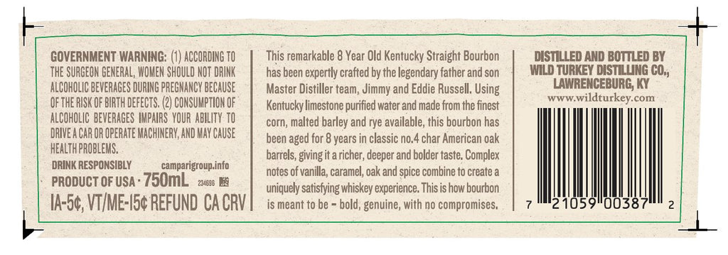 Wild Turkey 101 8-Year Kentucky Straight Bourbon Whiskey is a testament to masterful distilling by the legendary father and son duo, Jimmy and Eddie Russell. Distilled and bottled in Lawrenceburg, Kentucky, this bourbon uses Kentucky limestone-purified water and the finest grains, aged for 8 years in no. 4 char American oak barrels. With an ABV of 50.5% (101 proof), this bourbon embodies a deep and bold taste profile. Expect a harmonious blend of complex notes featuring vanilla, caramel, oak, and spice, delivering a genuine, full-bodied whiskey experience that's rich and satisfying.